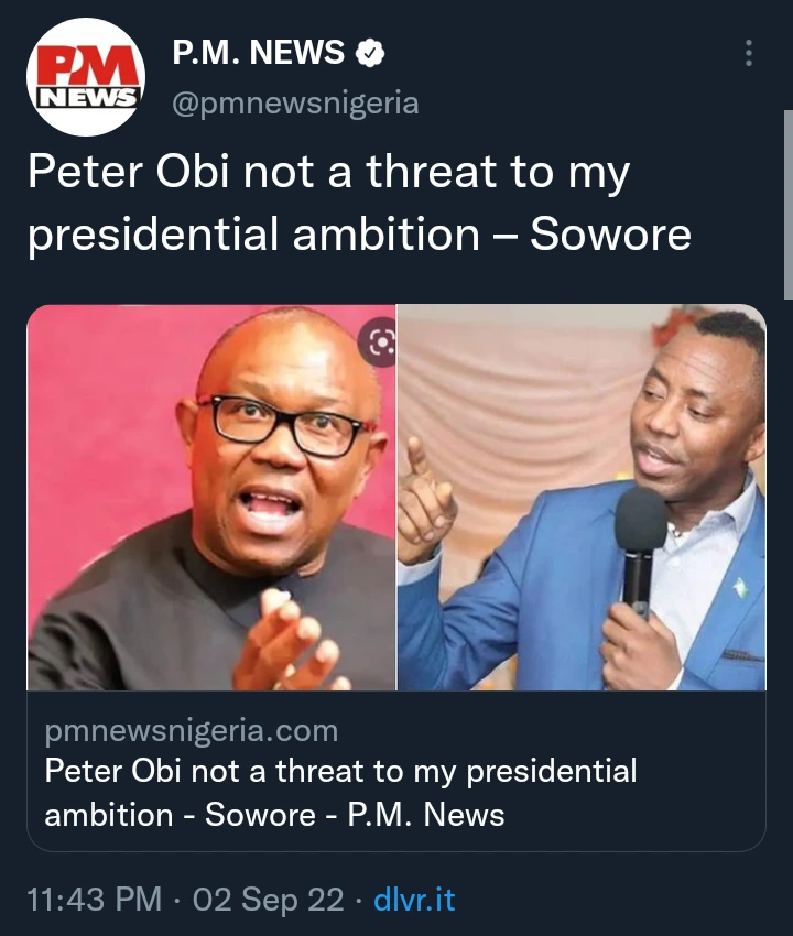 Mr Omoyele Sowore, the presidential flag bearer of the African Action Congress (AAC), has said Peter Obi of the Labour Party is not a threat to his 2023 ambition.